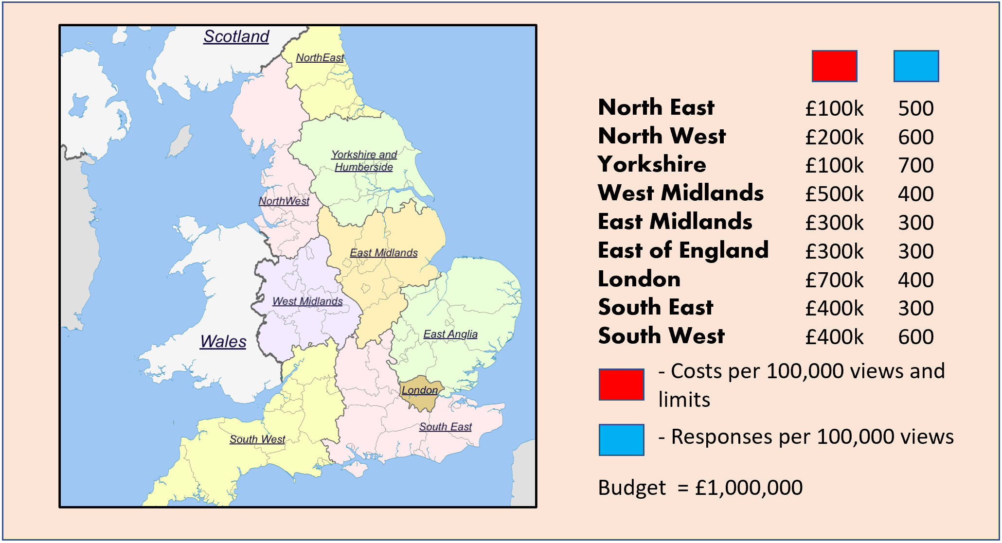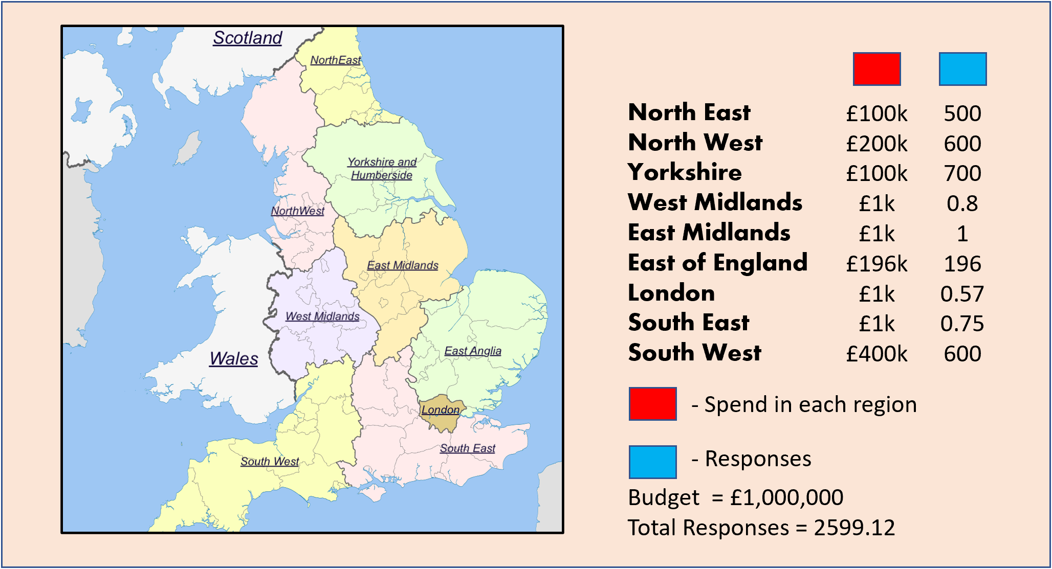Now consider the marketing campaign has a budget of £1,000,000. There is a minimum of £1000 that can be spent in each region. The optimal spend will look something like the illustration shown below.