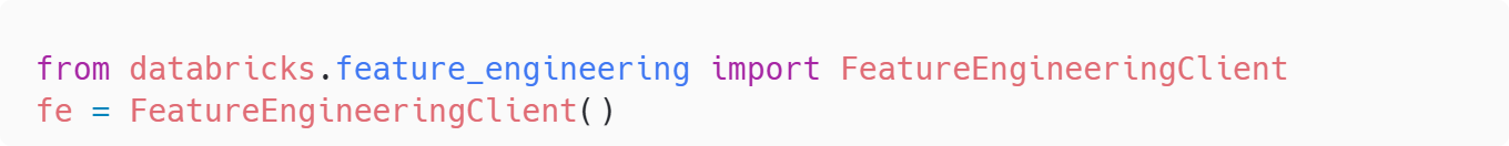 With the package in place, we create a FeatureEngineeringClient. This client is your entry point to the feature store APIs: you’ll use it to create tables and specs, spin up the online store, publish features, and build a serving endpoint. Think of it as the control centre for all feature operations in Databricks.
