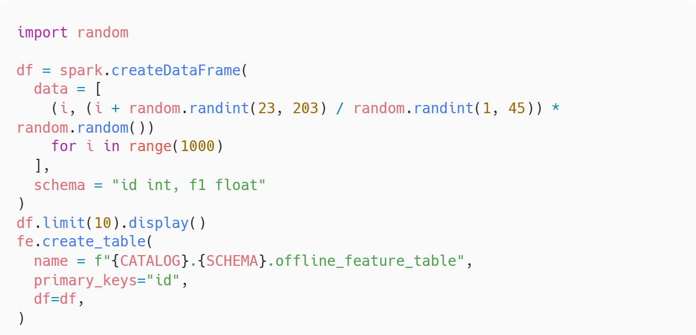 The next step creates a small toy dataset to keep things simple. Using Spark, we build a DataFrame with an id and a single float feature f1. This is just test data to prove the pipeline end to end. We display a few rows to sanity-check it, then call fe.create_table(...) to register an offline feature table in Unity Catalog keyed by id. The offline table is your source of truth for analytics and batch inference, and having a well-defined primary key is essential. Everything downstream, including lookups and serving, relies on that key consistency.