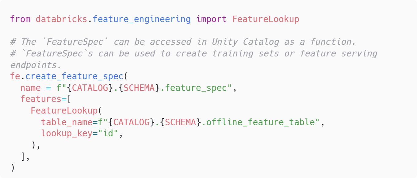 Once the table exists, we define a FeatureSpec. The spec references the table and declares how features are looked up. Here, by id. Specs give you a tidy, reusable definition you can point both training jobs and serving endpoints at. Because the spec is stored in Unity Catalog, other users can discover and reuse it without needing to know the raw table paths or column details. It’s a small step that pays off massively in keeping things standardised.