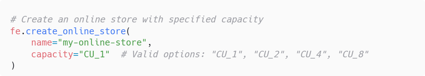 Now it’s time to create the online store backed by Lakebase. We call fe.create_online_store(...) with a name and a capacity unit, starting with CU_1. Capacity is about throughput and latency requirements; you can scale up to CU_2, CU_4, or CU_8 as traffic grows. The store is fully managed, so you don’t have to worry about provisioning or patching a database. Pick a capacity, let the platform do the heavy lifting, and adjust later based on real-world load tests.
