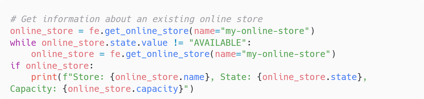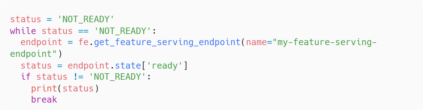 As with the store, we wait until the endpoint reports a READY state before trying it out. Again, if you’re putting this in CI/CD or a scheduled job, add a timeout and sensible error handling. Nothing worse than a job that waits forever and blocks your deployment window.