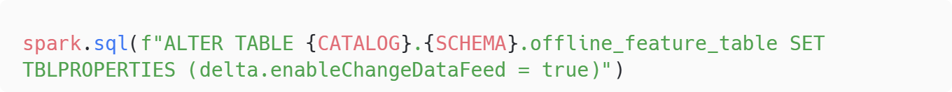 Before we publish anything, we enable Delta Change Data Feed (CDF) on the offline feature table with a quick ALTER TABLE statement. CDF is what allows changes in the offline table (new rows, updates, deletes, etc) to be tracked efficiently and reflected in the online table. Without this, you’d end up cobbling together your own sync logic. With CDF on, Lakebase can keep the online copy up to date with minimal fuss.