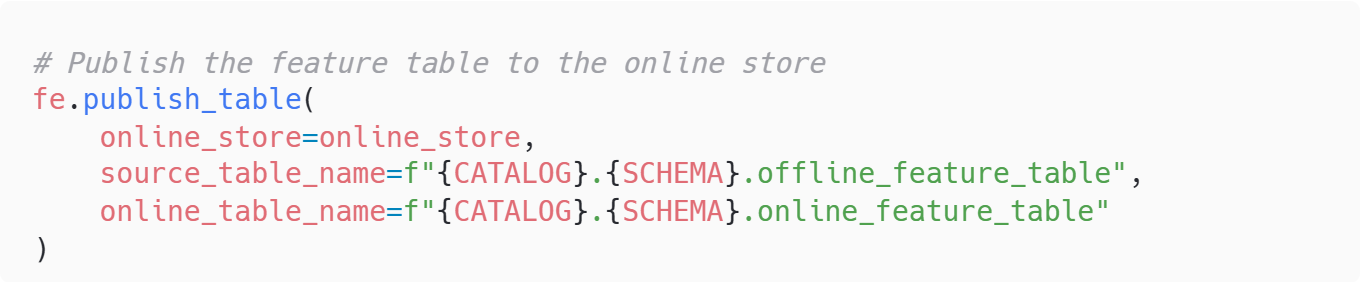 Publishing the offline table into the online store is a single call: fe.publish_table(...). You pass the store, the source offline table, and the name you want the online table to have. From here on, updates to the offline table will flow through to the online one, which is exactly what you want for real-time inference. Fresh features, ready when your endpoint asks for them!