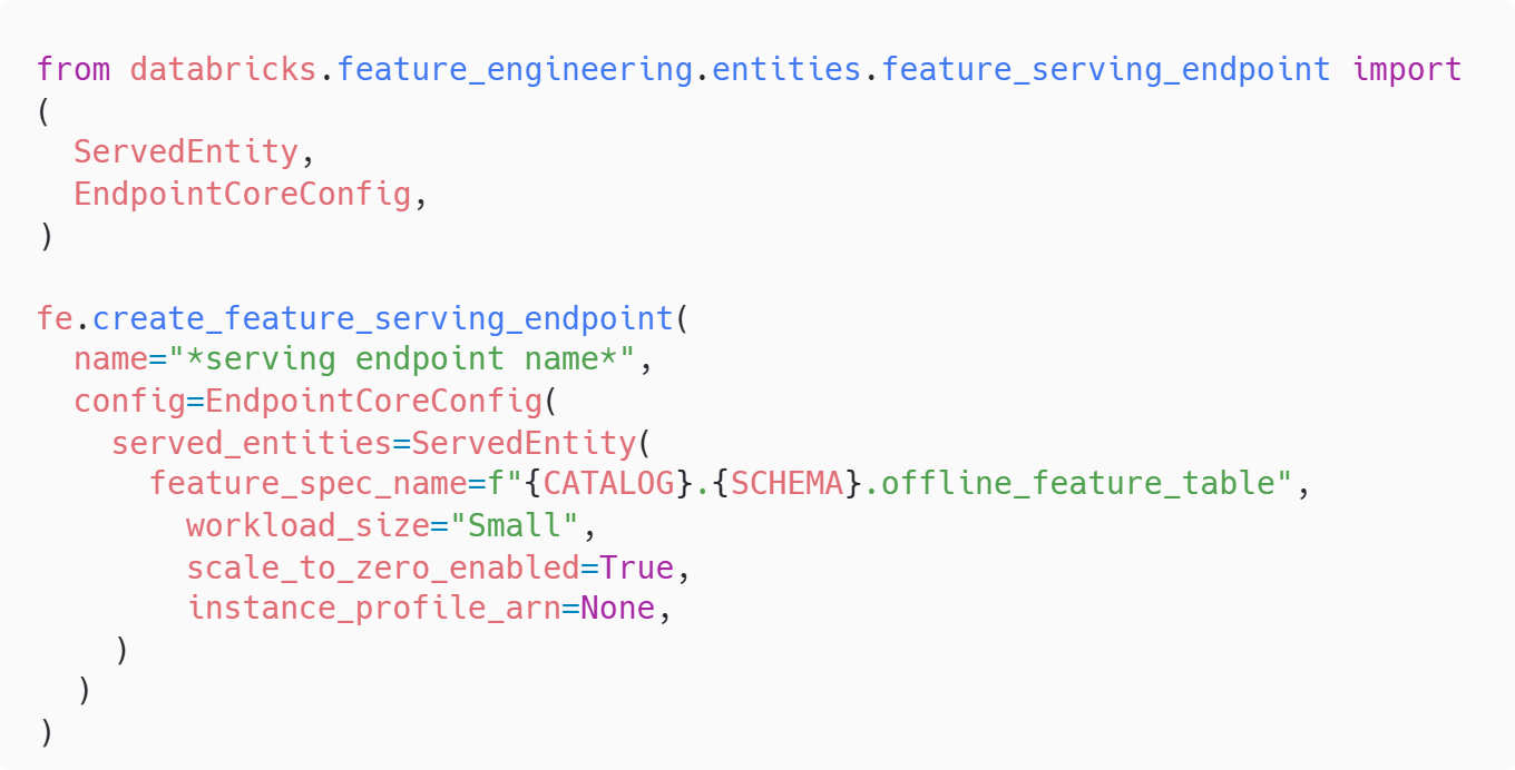 The section then creates a feature serving endpoint. The config sets a small workload and enables scale-to-zero, which is handy for controlling costs when the endpoint isn’t being queried. In many setups you’ll point the endpoint at the FeatureSpec rather than directly at the table because specs give you portability and clarity; this example shows both patterns in spirit, but in production it’s cleaner to stick to the spec-centric approach, especially if several tables feed the same logical feature set.