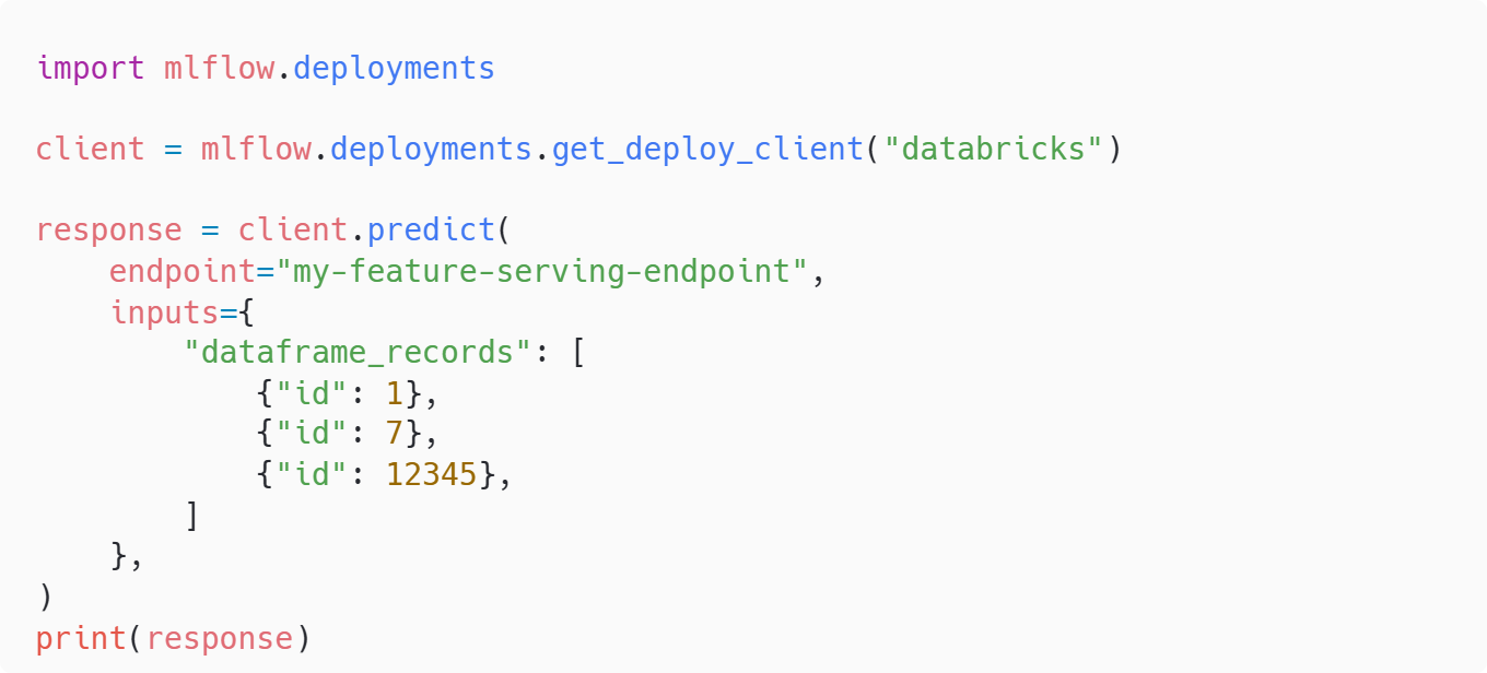 To test the endpoint, we use MLflow Deployments to send a few id values and read back the features. The payload uses dataframe_records, which keeps the format familiar to anyone used to Pandas or Spark. You’ll typically see returned features for keys that exist and nulls or empties for keys that don’t. That’s your cue to add guardrails in client code: treat missing features as a signal to fall back to defaults, short-circuit a request, or log for investigation depending on your app’s needs.