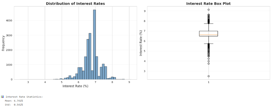 From the histogram and box plot of interest rates, we can see that most loans are clustered tightly around the ~6.7% mark, with a relatively small spread (standard deviation just over half a percent). The distribution looks roughly bell-shaped with a slight right tail, which lines up with a few higher-rate outliers pushing towards 9% on the upper end and a handful of older/legacy low-rate loans on the lower end.