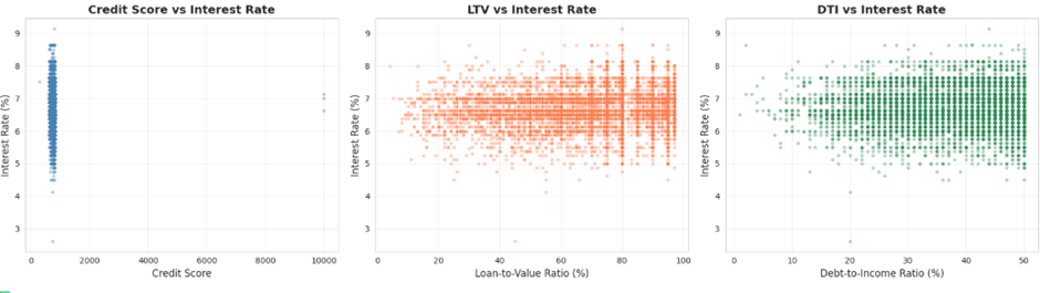 - Credit Score, LTV, and DTI all show meaningful but noisy relationships with rate, which makes them strong candidates for our feature set.