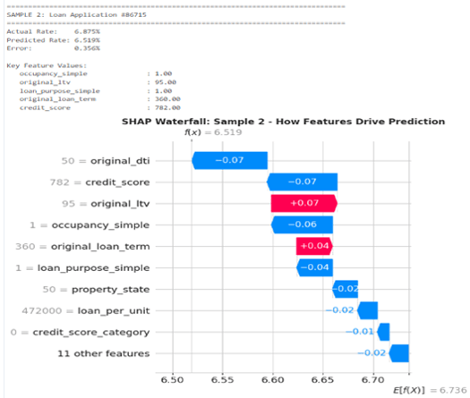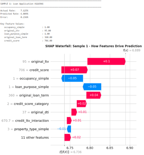 - At the individual loan level, each prediction is decomposed into a base rate (6.736% in this dataset) plus a series of feature contributions that sum to the final quoted rate.