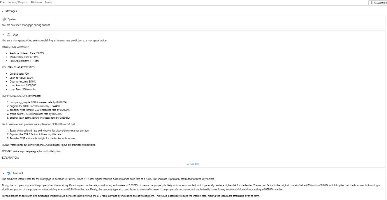 This turns the model into a conversational tool: a broker can request a quote, immediately see the numerical breakdown, and also receive a ready-made explanation that is consistent, compliant and easy to share with the borrower.